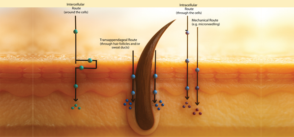 • Trans appendageal Route (via hair follicles and sweat ducts) Products can bypass the stratum corneum and move down hair shafts or sweat ducts. What helps: Exfoliation and cleansing to keep follicles open, plus nanoparticles or emulsions that target follicular delivery.